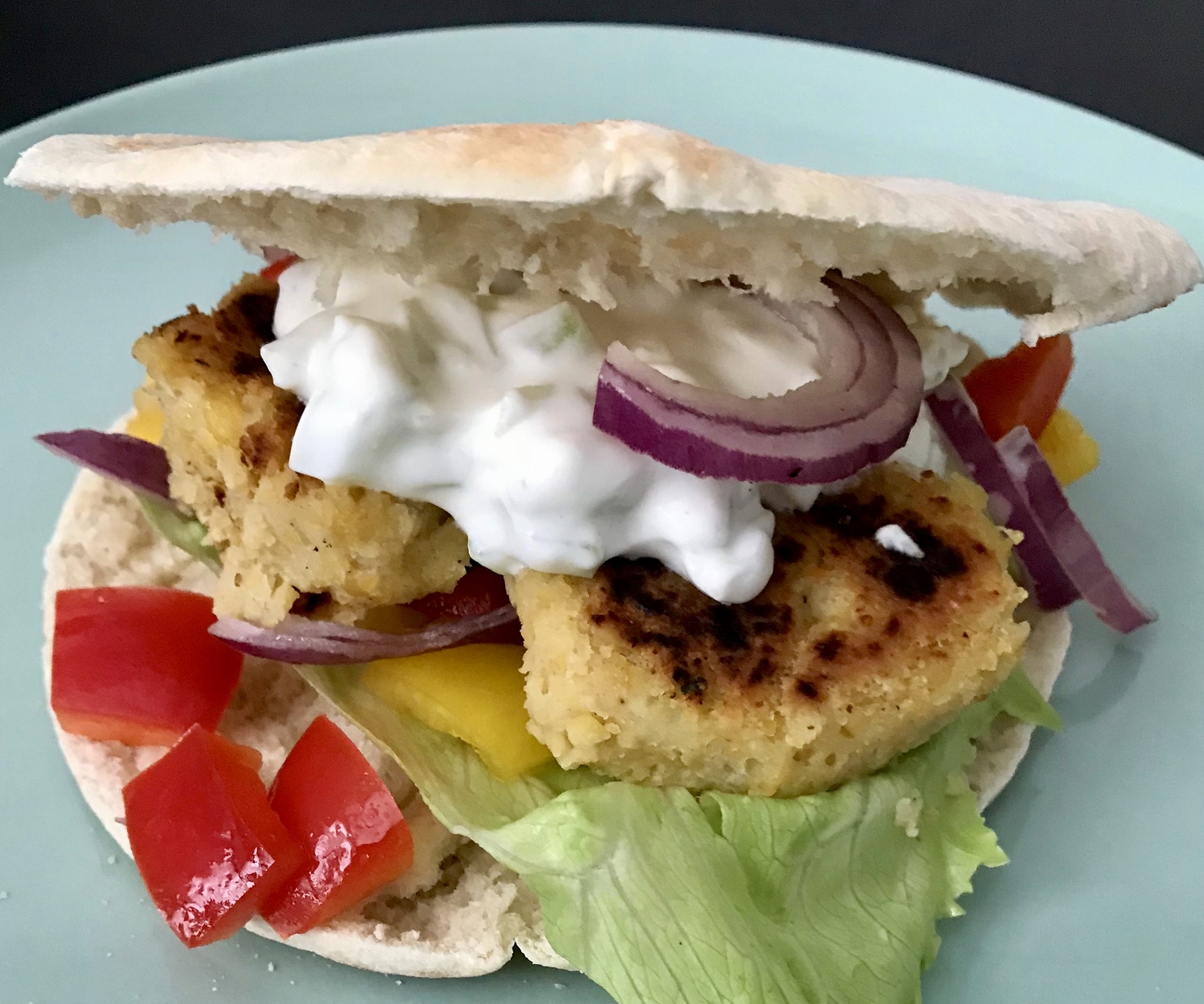 Verhit de rest van de olie in een koekenpan en bak de falafel op middelhoog vuur. Rooster de pitabroodjes.