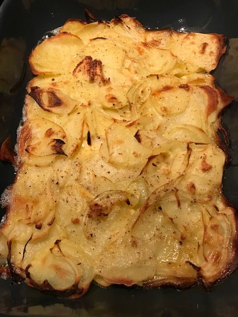 Meng in een aparte schaaltje de ei met de slagroom en breng op smaak met peper, zout en nootmuskaat. Verdeel het eiermengsel over de aardappelen en bak ze in ca 35 minuten gaar.