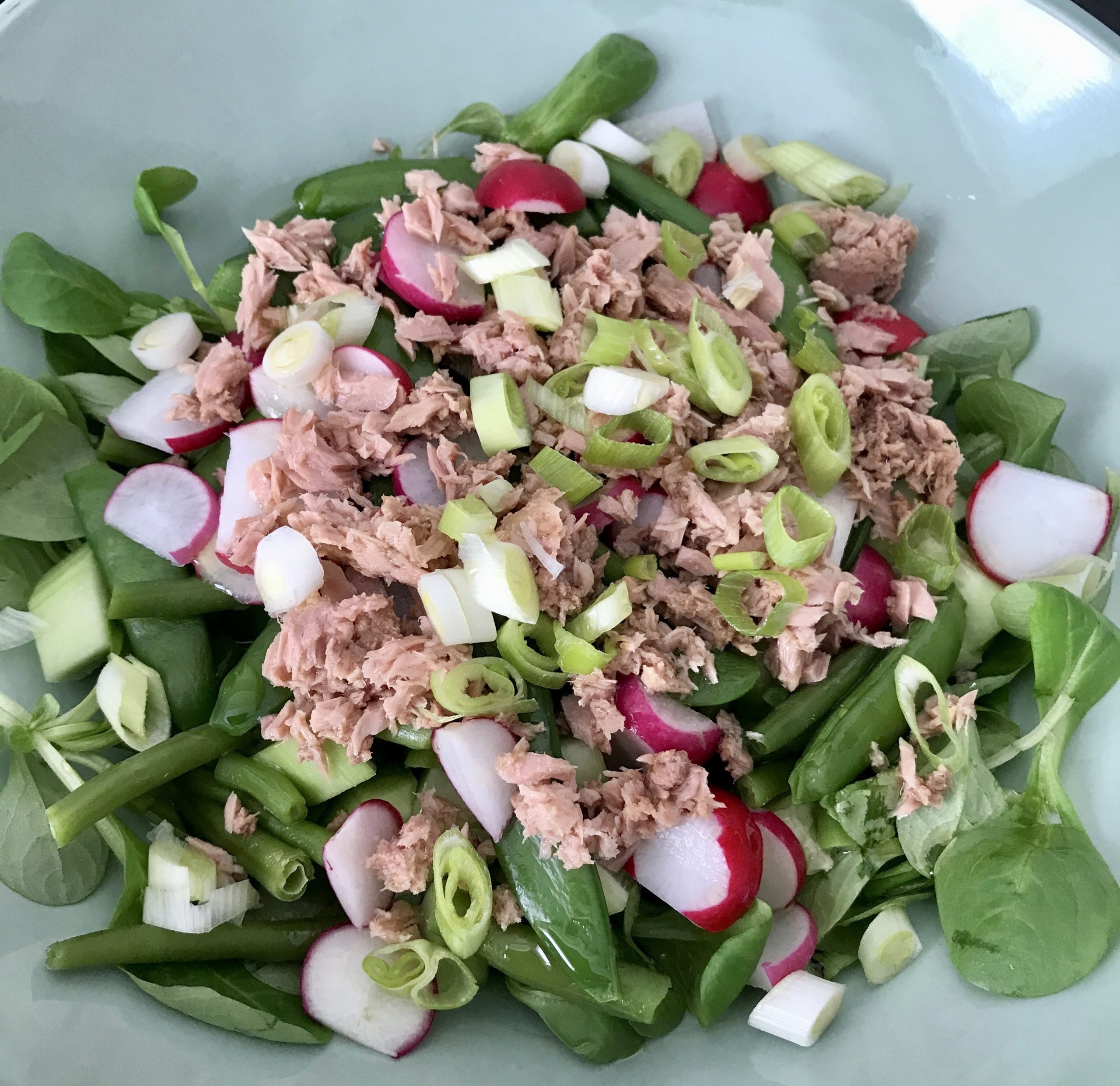 Giet de pasta af en spoel in een vergiet koud onder stromend water. Laat uitlekken en doe in een platte schaal. Voeg vervolgens de veldsla, sperziebonen, sugarsnaps, komkommer, lente-ui, radijs, tonijn en olijfolie toe. Breng op smaak met peper en zout.